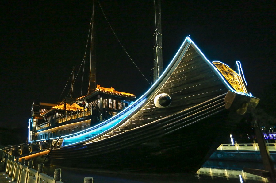央廣網(wǎng)寧波1月21日消息(記者杜金明 通訊員 胡谷懷 葉嘯天)1月18日晚,寧波市鎮(zhèn)海區(qū)招寶山街道亮化工程完工,進入試亮燈階段,鼓樓、牌坊、神舟古船等標志性建筑在燈光映襯下展現(xiàn)鳳冠霞帔的絢麗圖景。