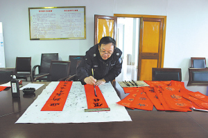 在這個臨時的春運執(zhí)法檢查站里,一大摞飄有墨香的春聯(lián)整齊擺放著,它們全出自鄞州交警大隊盛墊中隊的楊萌萌之手。據悉,楊萌萌自幼酷愛書法,作品曾被編入《全國公安交警書法美術作品集》。因為長期與“交通安全宣傳”打交道,每年春運他都會書寫春聯(lián)送給交通參與者。前天他得知大隊要抽調中隊民警到高速朝陽入口執(zhí)法檢查,于是買來紅紙,花了3個多小時,寫了100副春聯(lián),第二天一大早就送到了執(zhí)法檢查站。(記者 王曉峰)